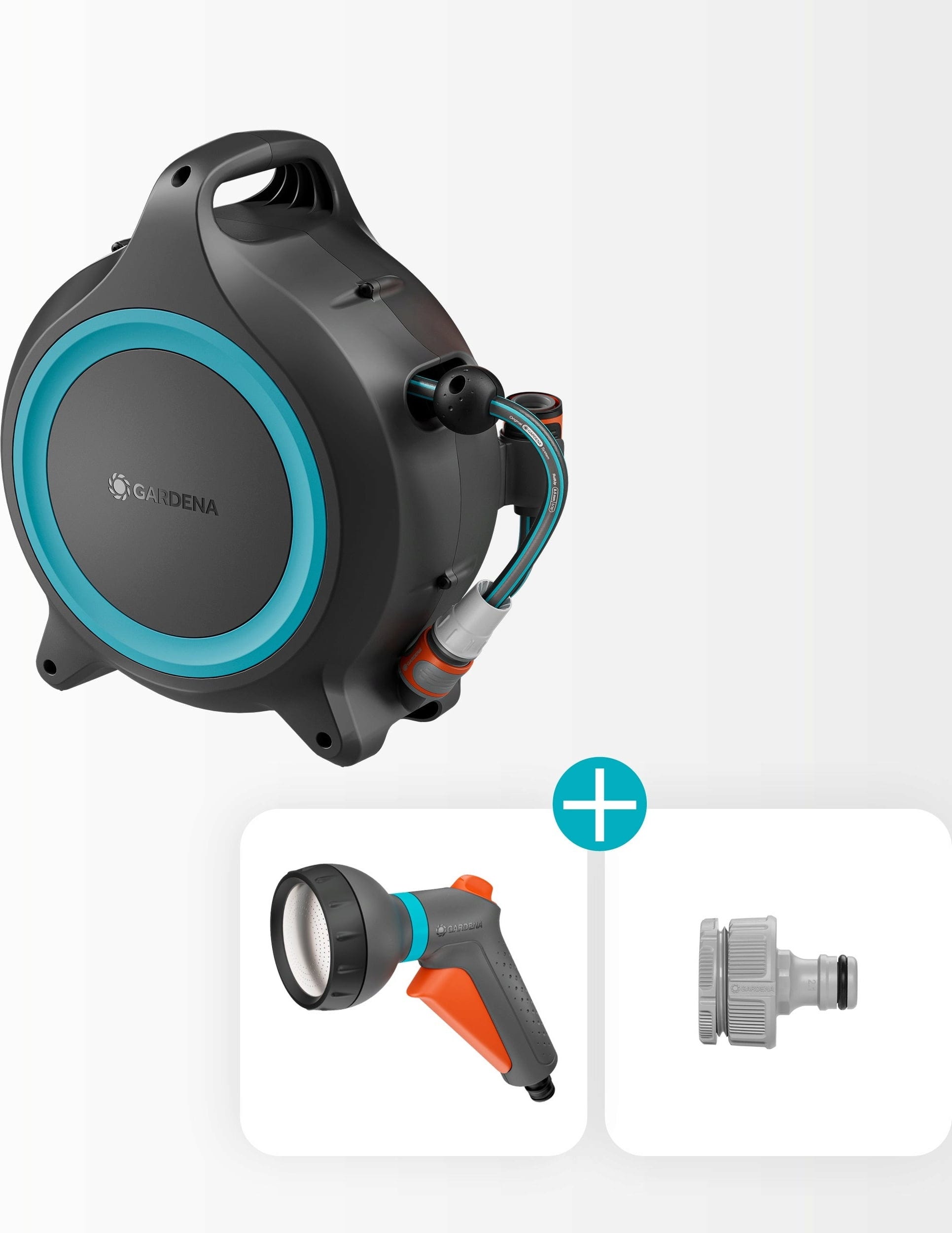 1 x tragbare Schlauchbox Move mit 12 m Schlauch (8,5 mm), 1 x Classic Spritze, 1 x Hahnverbinder mit Adapter, 1 x Gerätehalterung