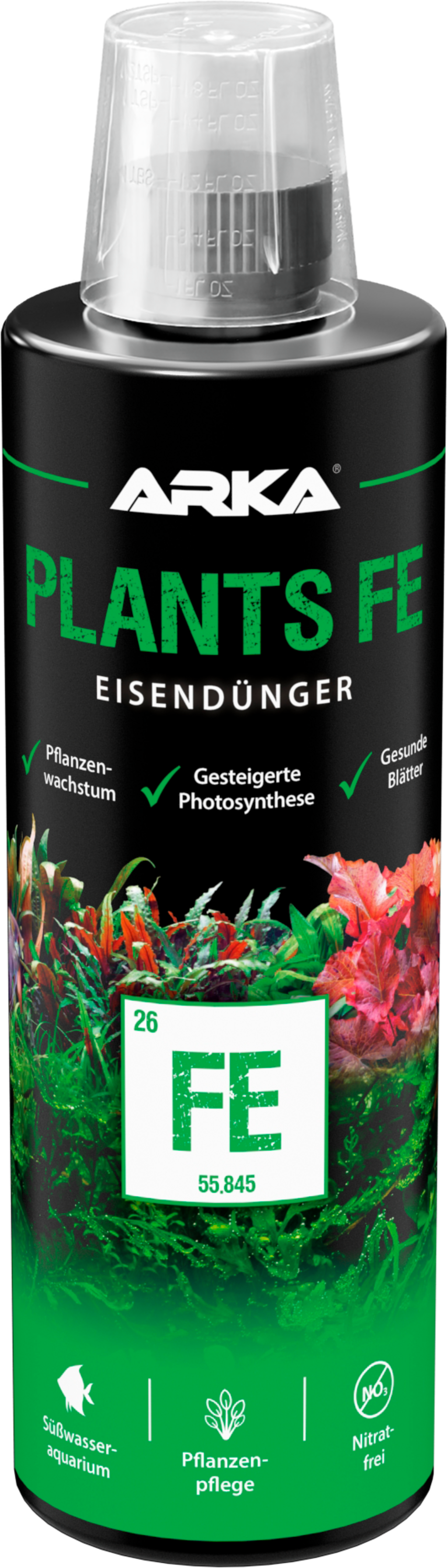 - Gib 1 ml Plants Fe auf 100 l Wasser, um den Eisengehalt um 0,1 mg/l zu erhöhen.