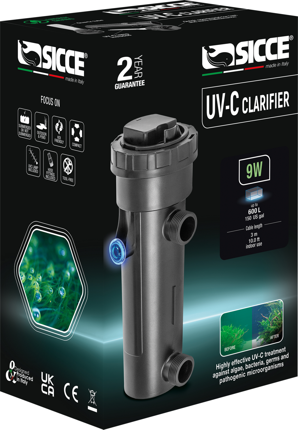 Dieser praktische UV-C Klärer von Sicce sorgt auf effektive Weise für kristallklares Wasser und ein optimales Umfeld für deine Wasserbewohner. Das Besondere an diesem UV-C Klärer ist seine vollständige Tauchfähigkeit gemäß IP68-Standard. Das bedeutet, du kannst ihn problemlos direkt in deinem Teich oder im Filterbecken deines Aquariums versenken. Seine kompakten Abmessungen machen ihn dabei zu einem flexiblen Allrounder, der sich leicht in jede Umgebung integrieren lässt – sei es im Aquarium, im Schildkrötenbecken oder im Gartenteich.
