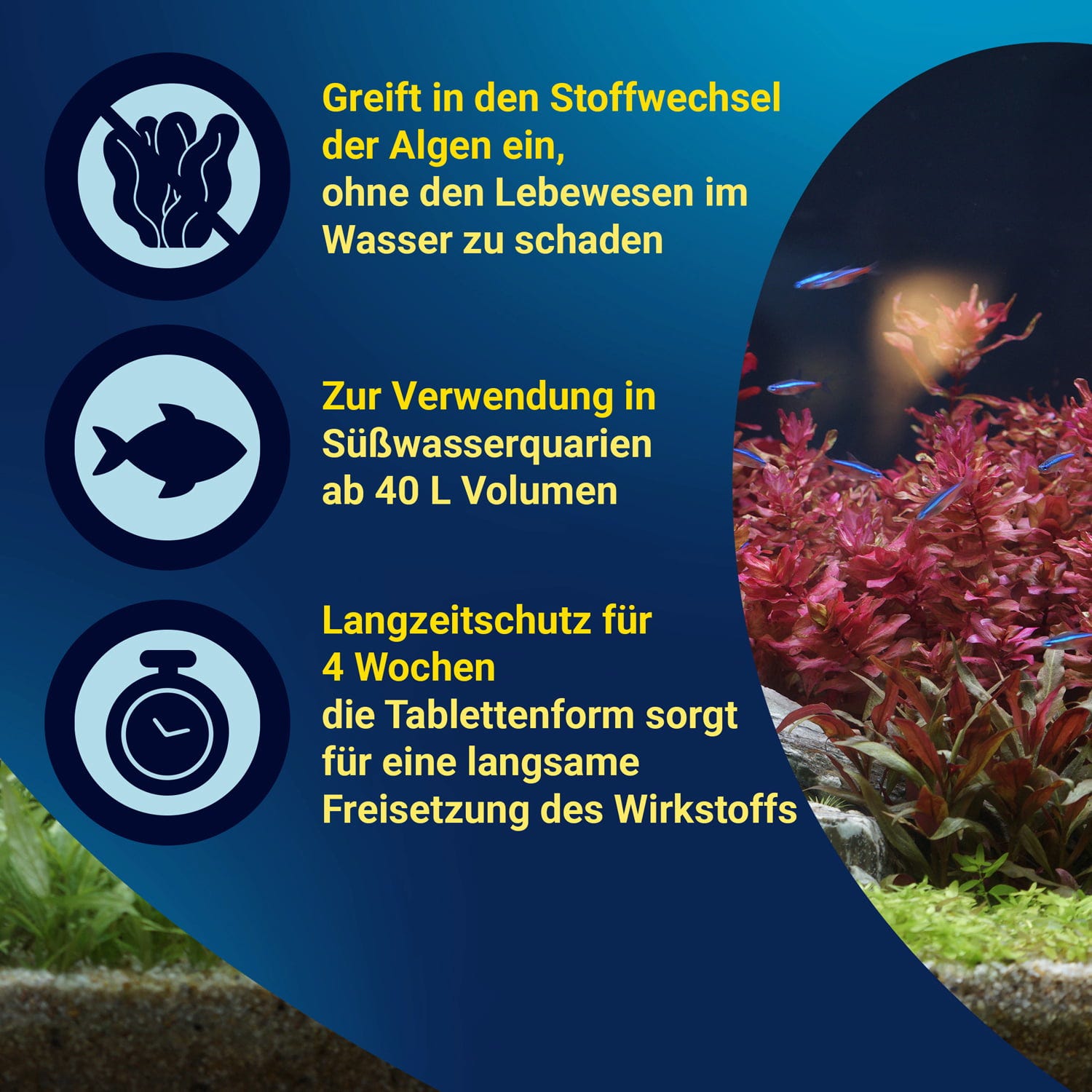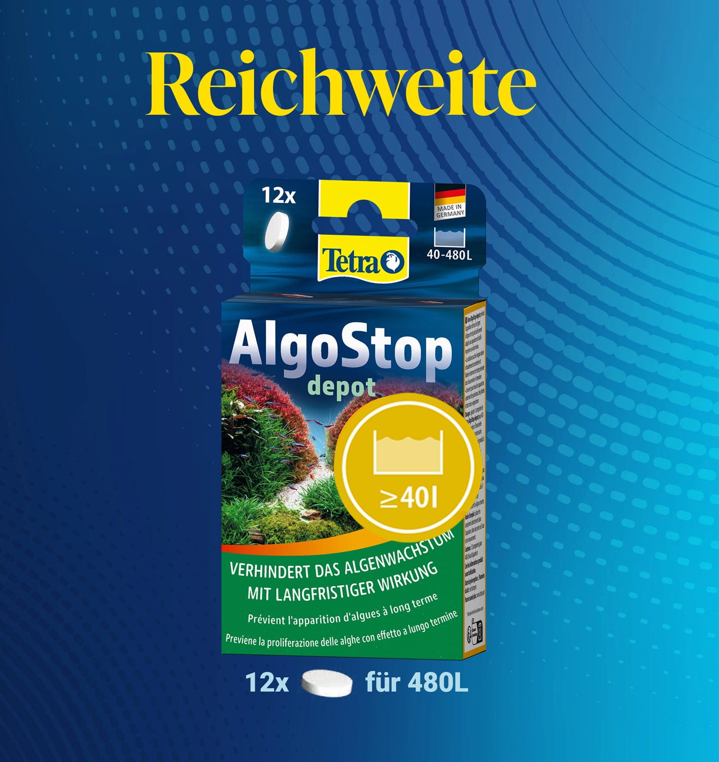 Tetra AlgoStop Depot sind formstabile Tabletten zur gezielten Langzeitbekämpfung von Algen im Süßwasseraquarium. Die Tabletten vernichten Pinsel- und Fadenalgen und beugen weiterem Algenwuchs vor. Der Depotwirkstoff dosiert die Abgabe der Wirkstoffe über einen Zeitraum von ca. 6 Wochen. Abgestorbene Pflanzen- und Algenreste sollten mit einem Fangnetz manuell aus dem Aquarium entfernt werden, um die Wasserwerte nicht zu verändern. Schwebstoffe werden ausgefiltert.