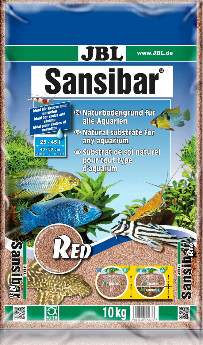 JBL Zanzibar RED is a recoloured natural ground with coarse-grained, rounded sand for all aquariums and optimal for grounding animals, as this fine rounded quartz sand also occurs in the native waters of these animals. In fish such as rays, thorns and catfish, etc. the sensitive barbels are protected with this sand. The fine grain and dense storage prevents the infiltration of mulch and other waste, thus preventing decay processes that could hinder plant growth. For magnificent plant growth, we recommend JBL AquaBasic plus long-term nutrient medium with JBL Zanzibar RED as a top layer. JBL Zanzibar RED releases neither hardeners nor unwanted silicates to the aquarium water.