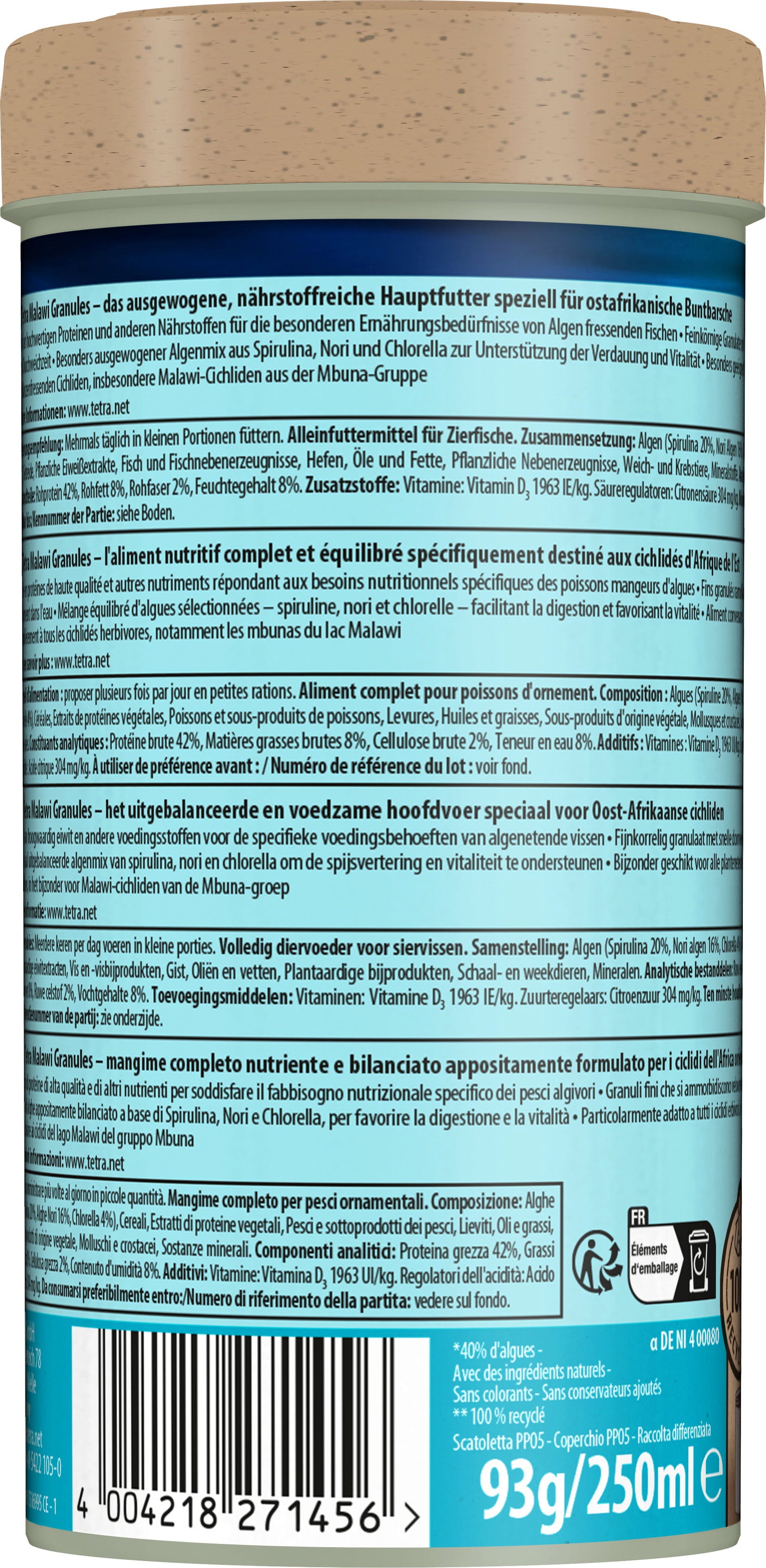Les granulés Malawi de Tetra répondent exactement à ces critères : l'algue de type Spirulina platensis, riche en protéines, soutient le système immunitaire des cichlidés, l'algue chlorelle est riche en acides gras essentiels et l'algue nori fournit également aux poissons des fibres et des minéraux importants. L'aliment est donc riche en protéines végétales et en nutriments importants, ce qui favorise à la fois la digestion et la vitalité des cichlidés. L'algue spiruline, riche en protéines, est complétée par deux autres types d'algues.