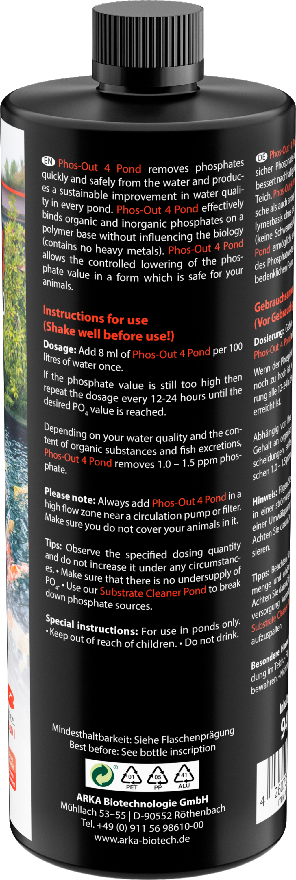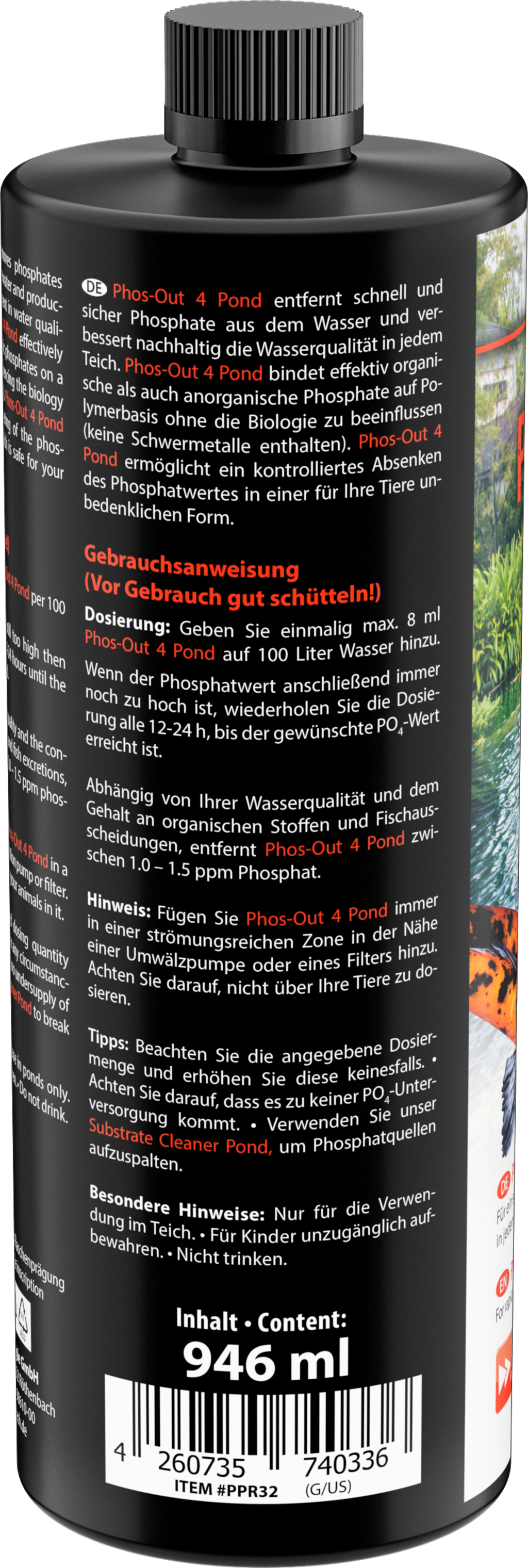 Pond Phos-Out 4 è un mezzo filtrante o assorbitore per una riduzione rapida ed efficace del valore PO4 nell'acqua del laghetto. Il prodotto rimuove i fosfati in modo rapido e affidabile, mentre la qualità della vita e dell'acqua di tutti gli abitanti del laghetto aumentano in modo sostenibile. La preparazione a base di polimeri rimuove delicatamente tutti i fosfati organici e inorganici senza influire sulla biologia del laghetto. L'abbassamento controllato del valore PO4 è innocuo per gli animali.