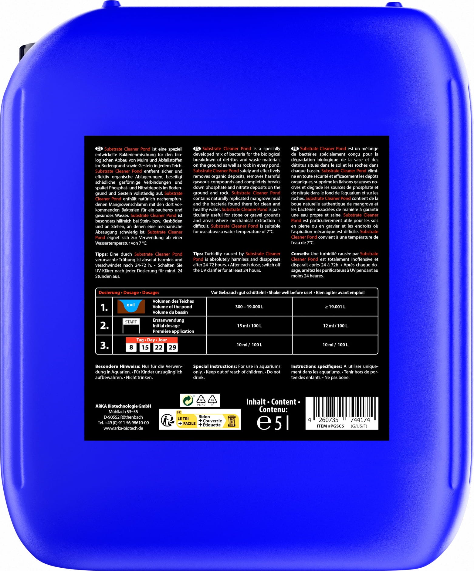 Pond Substrate Cleaner funziona come un potente detergente biologico estremamente efficace per i laghetti. Il prodotto contiene batteri appositamente sviluppati che eliminano i fanghi e altri rifiuti organici dal substrato. I composti gassosi nocivi si dissolvono, mentre i depositi di fosfati e nitrati vengono completamente scomposti. I batteri agiscono in modo affidabile anche su substrati che rendono difficile l'aspirazione meccanica, come substrati con pietre o ghiaia. Il prodotto inizia a lavorare a partire da una temperatura dell'acqua di 7 °C. Inizialmente, la preparazione può causare un'innocua torbidità dell'acqua, ma dopo 24-72 ore l'acqua torna limpida.
