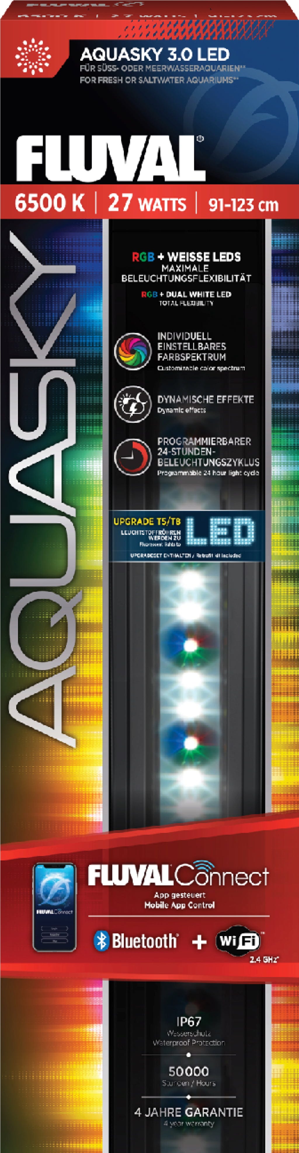 Con la AquaSky LED 3.0 di Fluval trasformi il tuo acquario in uno spettacolo luminoso dinamico, comodamente controllabile tramite smartphone. Grazie all’app FluvalConnect e alla nuova connessione WiFi e Bluetooth, puoi regolare lo spettro cromatico delle LED RGB e delle numerose LED bianche in base alle tue preferenze.