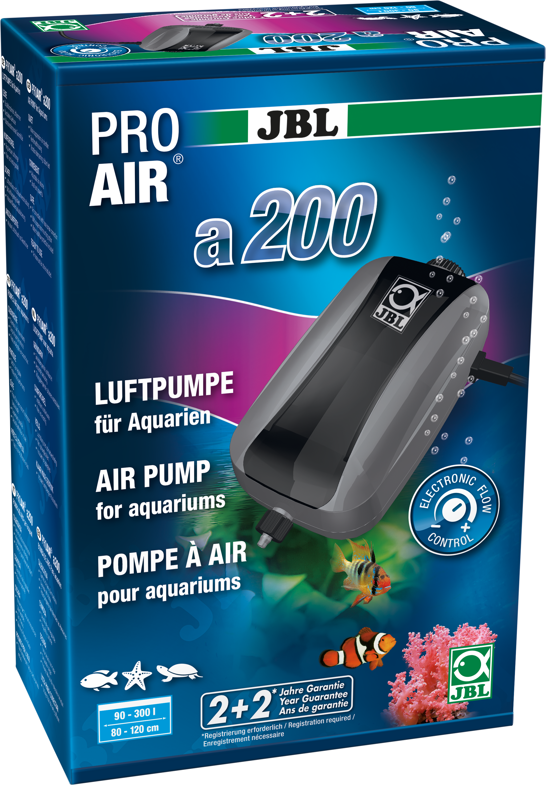 Grazie alla speciale camera d'aria fonoassorbente, alle pareti rinforzate e ai piedini in gomma antivibrazione, il dispositivo funziona in modo particolarmente silenzioso. Offre una portata d'aria di 200 l/h con un consumo energetico ridotto di soli 3,2 W. La regolazione elettronica consente inoltre di adattare con precisione il flusso d'aria alle esigenze di acquari da 90 a 300 litri.