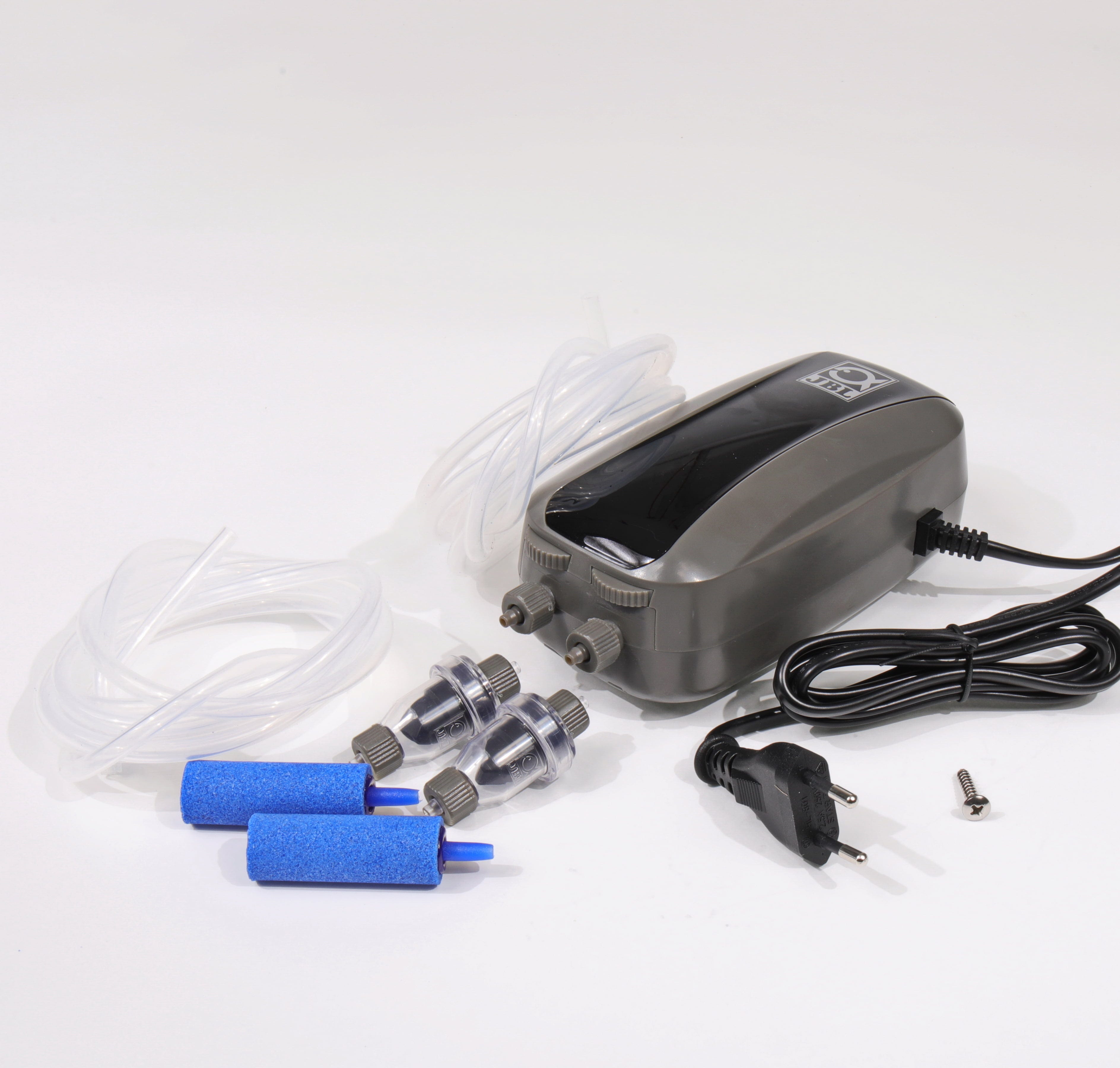 Per mantenere un funzionamento silenzioso, la pompa è dotata di una camera d'aria fonoassorbente, piedini in gomma antivibrazione e una struttura rinforzata. L'installazione è semplice e immediata, grazie alle valvole di non ritorno e alle pietre porose incluse. Con un consumo energetico contenuto di soli 5 W, offre un'aerazione efficiente per acquari fino a 600 litri.