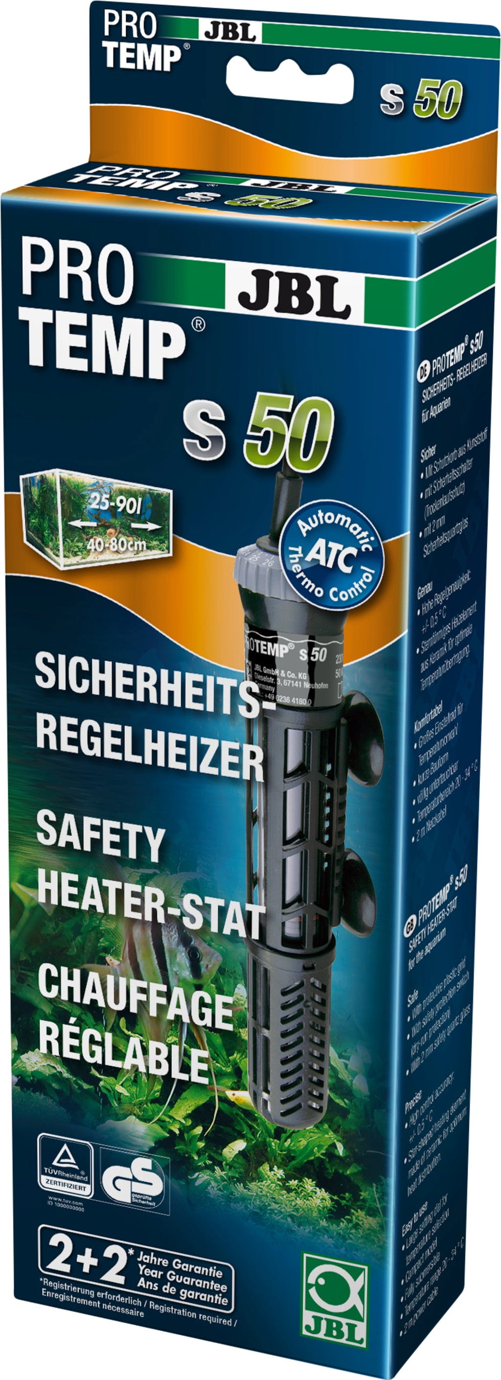 Contenuto: riscaldatore di sicurezza JBL ProTemp con cappuccio di protezione, 2 (+2) anni di garanzia (alla registrazione del prodotto).