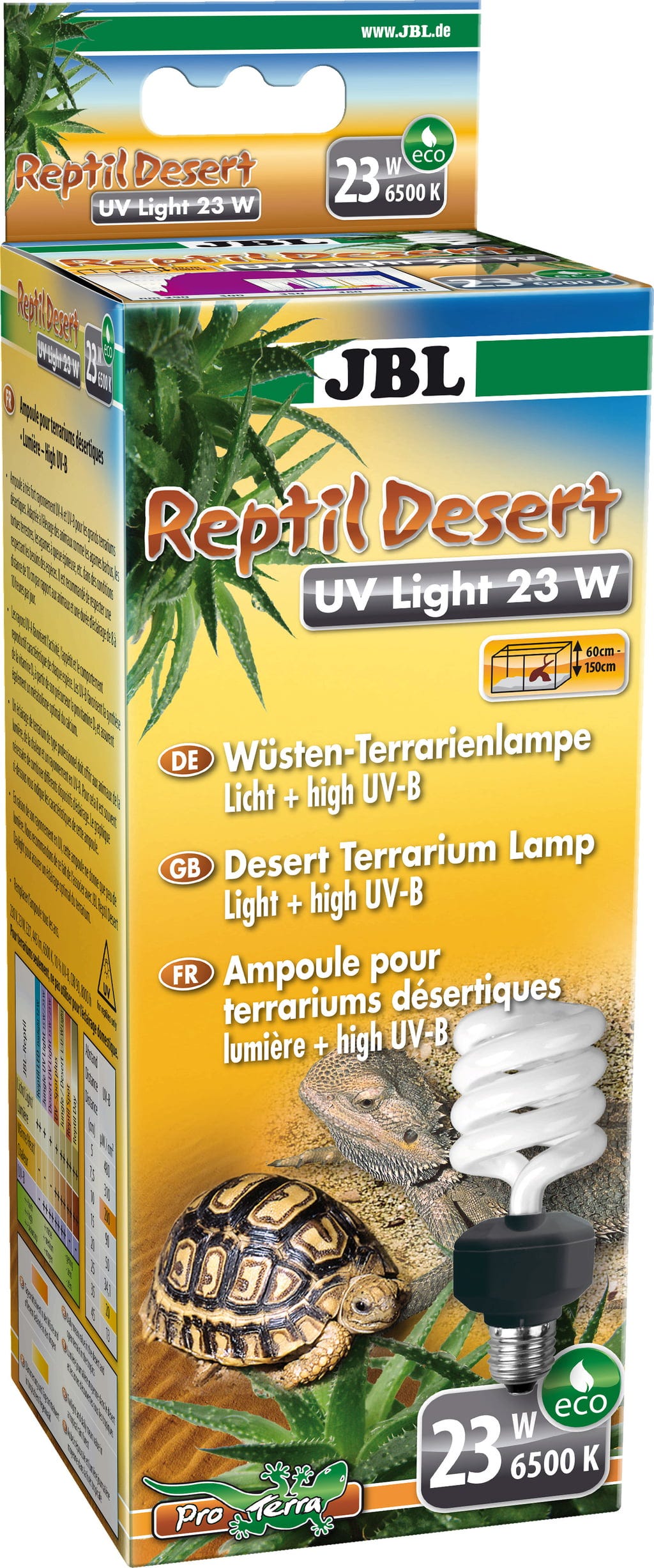 LaReptilDesert UV Light di JBL è una lampada compatta a risparmio energetico da 23 W, progettata per soddisfare le esigenze di illuminazione e di radiazione UV nei terrari desertici. Grazie all'elevata emissione di UV-A e UV-B, è ideale per garantire un'adeguata esposizione ai raggi UV per i rettili.
