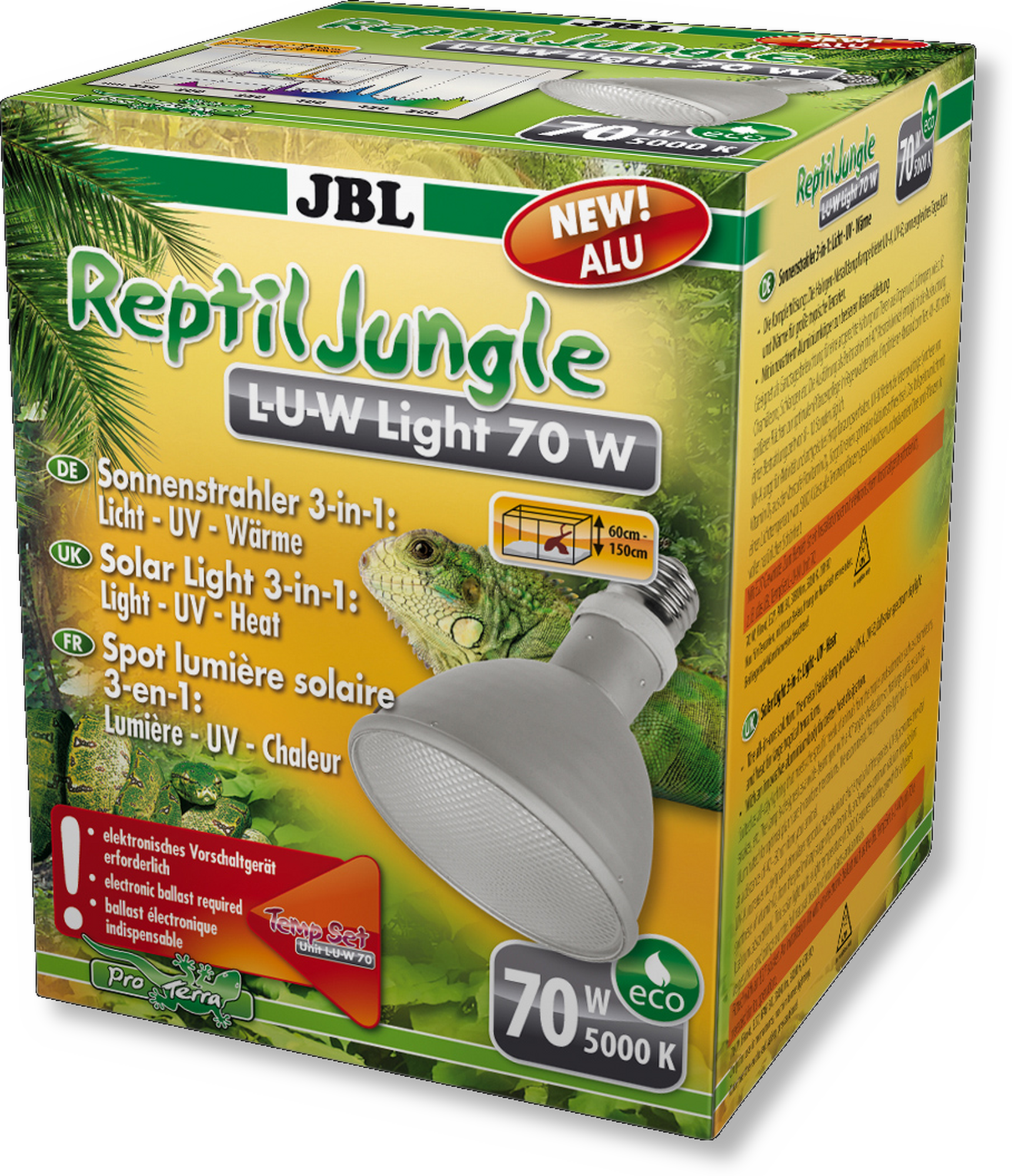 LaReptilJungle L-U-W Light alu di JBL è una soluzione completa 3 in 1 che, con una temperatura di colore di 5000 K, garantisce per 10-12 ore al giorno condizioni ottimali di luce, radiazioni UV e calore nei terrari tropicali. Questo faretto a spettro completo è realizzato in alluminio e genera un fascio ampio di 40°. L'alloggiamento robusto in alluminio assicura un'eccellente dissipazione del calore, consentendo prestazioni elevate e una maggiore emissione di calore e UV, riducendo al contempo il rischio di surriscaldamento.