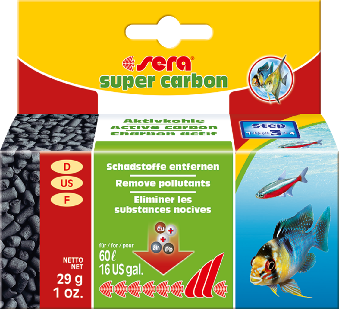 Sera Super Carbon è consigliato anche in casi di sospetto avvelenamento degli animali dell'acquario, ad esempio in seguito all'introduzione sostanze nocive durante i lavori di manutenzione o all'uso di decorazioni non idonee. Rimuove inoltre fastidiose colorazioni dell'acqua, lasciandola limpida.